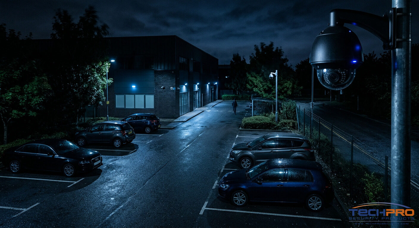 A TechPro technician conducts a nighttime or low-light evaluation of your property, measuring ambient light levels, identifying dark zones, and determining whether starlight-only or starlight + supplemental IR lighting is the optimal approach for each camera location.